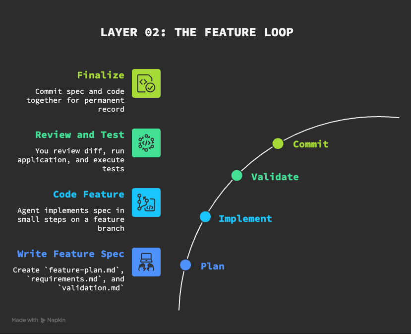 Every feature follows the same three-step cycle: Plan → Implement → Validate.
