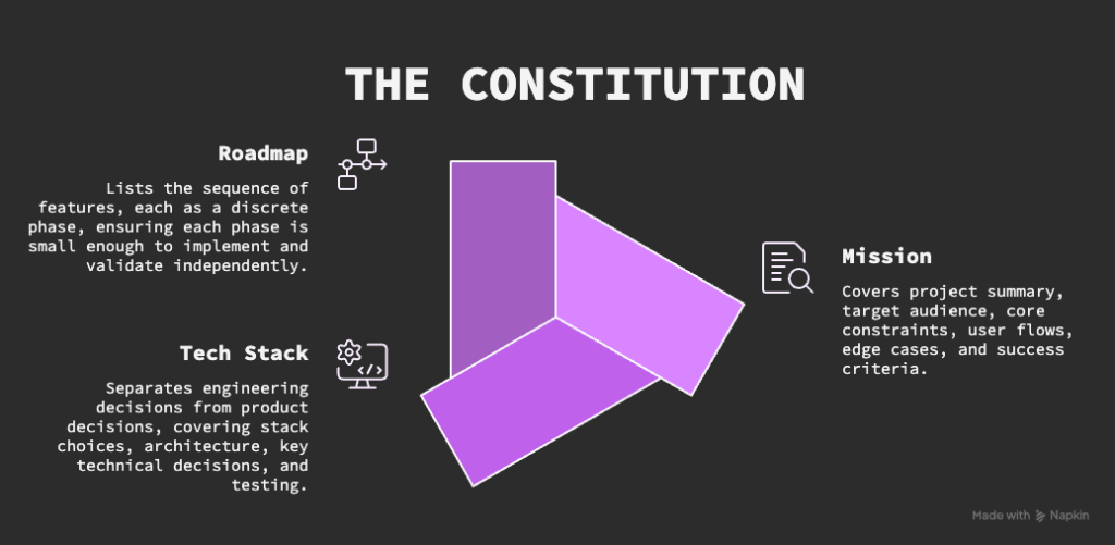 The constitution is written once at the start of the project — and updated whenever key decisions change. It answers three questions:
